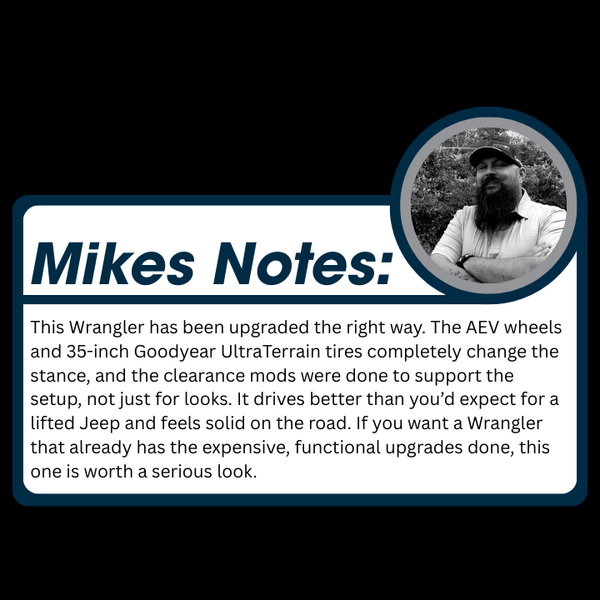 This 2009 Jeep Wrangler Sahara is a well-sorted, Colorado-owned example that blends classic Jeep character with tasteful, functional upgrades. If you’re looking for a used 2009 Jeep Wrangler Sahara for sale in Denver, Colorado, this one stands out with upgraded 35-inch Goodyear Wrangler UltraTerrain all-terrain tires, AEV 17-inch wheels, and clearance-enhancing modifications done with purpose. Powered by the proven 3.8L V6 and paired with a 6-speed manual transmission, it offers a raw, engaging driving experience. The vehicle shows consistent service history and remains solid and confidence-inspiring for its age, making it a great option for someone who wants capability without sacrificing drivability.