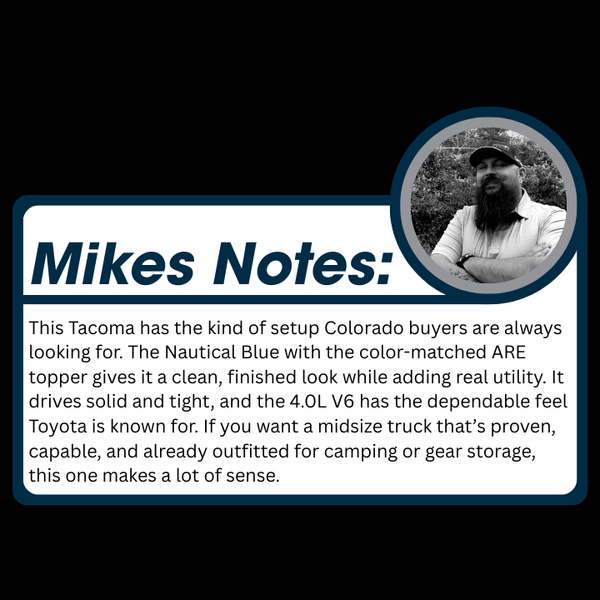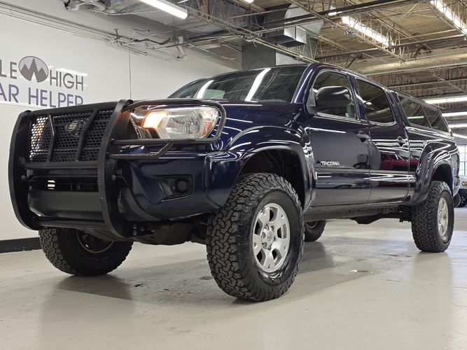 This 2013 Toyota Tacoma V6 4x4 Double Cab Long Bed is a well-kept Colorado truck with 105,104 miles and a clean vehicle history. If you are searching for a used 2013 Toyota Tacoma for sale in Denver, Colorado, this Nautical Blue Metallic example stands out with its color-matched ARE topper and strong service record. With three personal owners, no reported accidents, and consistent maintenance including recent suspension and brake work, this Tacoma reflects careful ownership. Powered by Toyota’s proven 4.0L V6 and equipped with practical towing and utility features, it is ready for work, recreation, or daily driving.